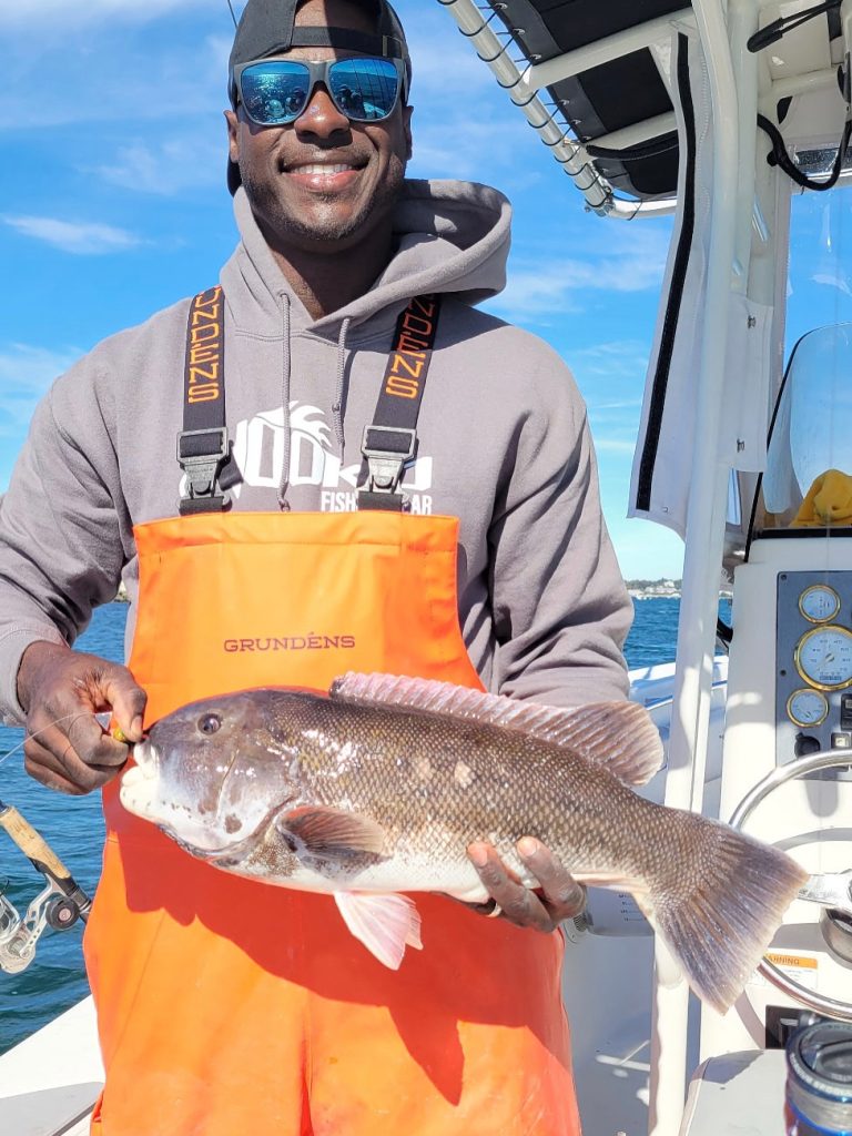 Captain Rob Taylor at Newport Sportfishing Charters continued to fish inshore this week, focusing just about all of his attention on tautog. The tautog bite has continued to improve and will only get better as the temperatures and fishing pressure continue to drop. Currently, these fish are still in relatively shallow water, so he’s been able to get the job done with light jigs. Tog can be found on the rock piles outside the bay, but there are plenty of fish up in the bay as well, which provided some refuge from the weather this week. There are still some bigger sea bass showing up as bycatch, so filling the coolers has been relatively easy. Rob also mentioned that the continued windy weather seems to have maintained the local striper bite. He has been able to find some nice fish on top on most of the days that he has dedicated some time to target them.