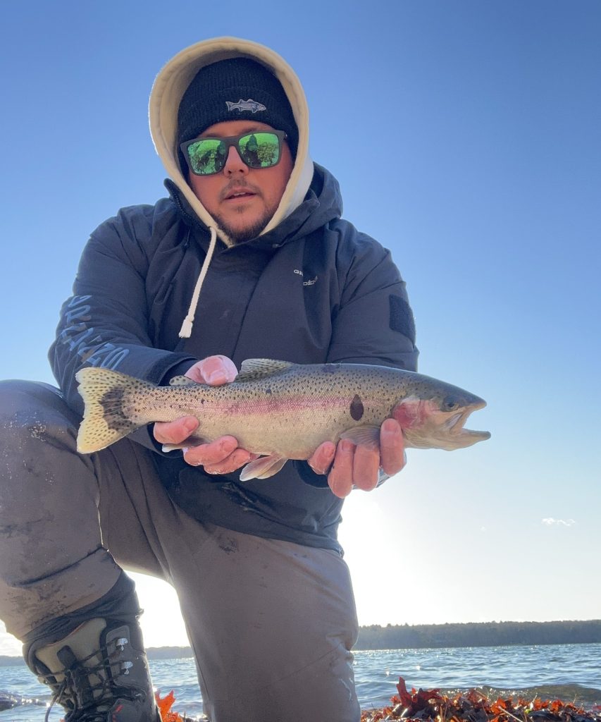 In my experience, rainbow trout fishing tends to be best on wind-blown shorelines, but that wasn’t the case earlier this week. As I waded a glassy kettle pond, rainbows were feeding super aggressively on small river herring and, at times, they crashed through schools of bait in mere inches of water. Every December, the bows seem to put on the feed bags prior to the first deep freeze of the season and it makes for some of the best trout bites of the year. On this day, the sun was shining bright and there was no cloud cover, so I tied on a trusty 1/4-ounce spoon and went to work. It sounds silly to compare the action to blitzing bass and blues, but that’s what these trout were doing. They’d corral a school of herring tight to shore and 2 or 3 fish would launch an assault that looked strikingly similar to a wolf pack of striped bass harassing peanut bunker. Whether I retrieved the spoon slowly just over bottom or ripped it in fast, the trout were undiscerning. In 90 minutes, I caught and released 15 fat rainbows that were spitting up 2- to 3-inch alewives. When they’re fired up like that, one of my favorite techniques is to keep the rod tip high and reel quickly to keep the spoon swimming just barely below the surface. An occasional twitch causes the spoon to skip and the trout, thinking they’re chasing a fleeing herring, follow and wake on the lure until it approaches shallow water and one commits to eating. It’s a unique scenario, but it’s the kind of bite that makes wading in frigid water for stockers a little more exciting.