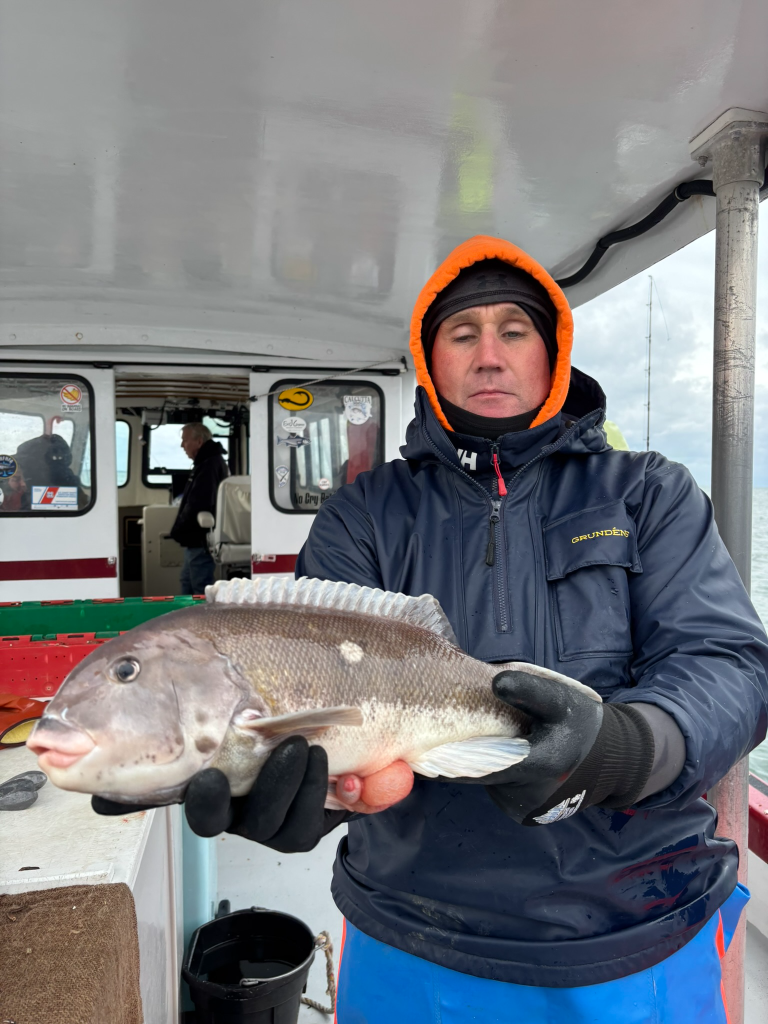 From the Eastern Sound, Nick Cancelliere reported: “Tog fishing on the east end is slowly fading, but there are still keepers to be found provided the water temperature doesn’t hit rock bottom. During a recent trip on the Nancy Ann IV, we didn’t end up with a full boat limit, but every angler in a crew of 12 got to bring home fillets. I landed two keepers and dozens of shorts. It was a slow grind of a bite, with a strong south wind that limited the wrecks we could target. Mike Dunne, who fished the stern beside me, landed the pool-winning tog, and Mikey ‘Potatoes’ was there for emotional support, as he did not contribute any keepers to the take but kept the crew laughing through the cold and the crab guts.”