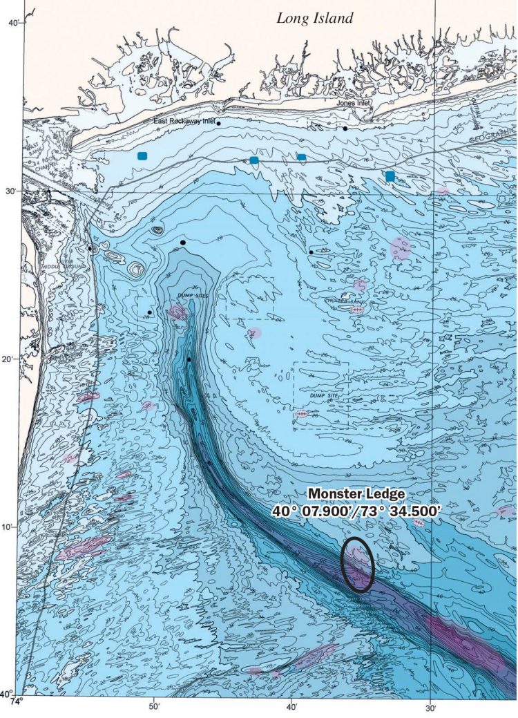 With a full livewell and 90s hip-hop blaring over the speaker system, we blasted through a glassy Rockaway Inlet and began the 35-mile trip south toward Monster Ledge. There, the sea floor drops suddenly from 120 feet into a 280-foot valley known to hold bluefin tuna and sharks-aplenty. The bottom composition is primarily sand and gravel, with scant vegetation, so the rocky ledges are what attract lobstermen to the area. The pots lining Monster Ledge attract mahi—from small “chicken” size to 30-pounders—when water temperatures reach the low 70s in the late summer. With supreme visibility on our side, we were ready to take advantage of this clear, windless morning on Lake Atlantic.