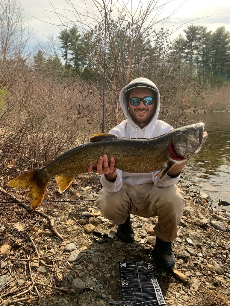 Since the Wachusett Reservoir reopened to the public for fishing on Saturday, April 6—as it does every year on the first Saturday in April—lake trout have been biting exceptionally well. During the spring, lake trout move into shallow water, sometimes as shallow as 3 to 10 feet, in pursuit of forage fish, thus making them more susceptible to shore fishermen who flock the reservoir come that first Saturday of the month. According to the Massachusetts Freshwater Catch and Release Records, David Desimone has the state record for caught-and-released lake trout with a 34-inch fish he caught in 2020; but that record is dated. In 2023, Jeff Evans caught a 37-inch laker from Wachusett, which earned him a gold pin and a plaque from the Massachusetts Freshwater Sportfishing Award Program. However, Evans’ record catch has been tied once and broken twice (by his own two friends) since the fishery opened less than a week ago. And, as with any good fishing story, these record-breaking fish did not come easily.