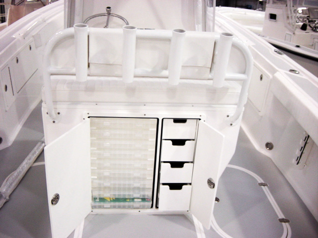 CHECK OUT fishing-friendly details including the 43-gallon bow fish box, three livewells, 35-quart YETI cooler, and plenty of tackle storage.
