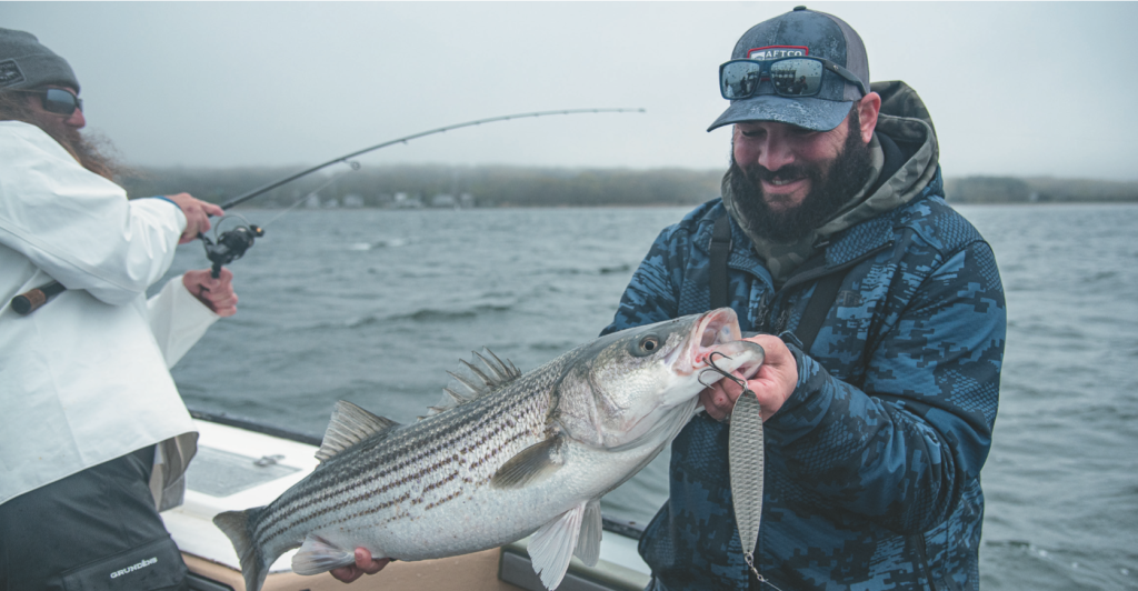 At times, Taylor will find stripers suspended over the bay’s deeper channels as they migrate in. He’s had success in these situations by fishing large glidebaits like the Big Ray made by Nate Medeiros of Southcape Swimbaits. The action and size of these baits can pull up bass holding 30 feet down over 65 feet of water.