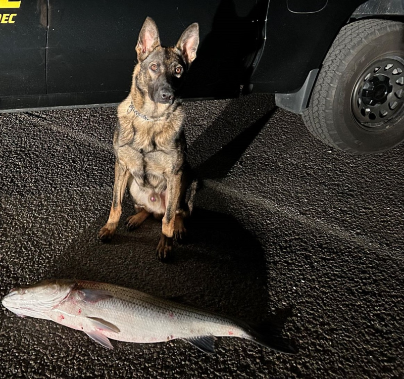 On Sept. 10, ECO Vandenbos conducted fishing compliance checks on anglers catching striped bass near the Ponquogue Bridge in the town of Southampton, Suffolk County. Officer Vandenbos responded to the location and contacted ECO DeRose and his newly graduated K9 partner, Finn, for assistance. K9 Finn is certified in striped bass detection. Officer DeRose arrived quickly, deployed K9 Finn, and the police dog alerted to multiple vehicles parked in the area. One vehicle contained a striped bass more than the legal-size limit of 28 to 31 inches in New York’s marine waters, and over the daily catch limit of one fish. The angler received one ticket for each offense, returnable to Southampton Town Justice Court.
