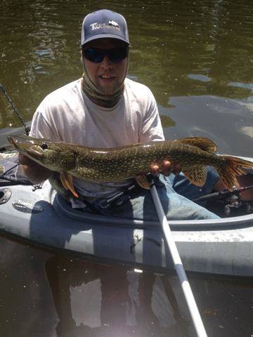 Pike – Pike fishing is still hot this week. Lake Zoar and Lillinonah have been giving up some great pike. Large bait fish like alewives or even live lined sunfish have gotten the attention of Mr. Toothy. Fish are still holding really tight to weed lines and timber but the average size being reported is a lot better this week, some up to 38 inches! A lot of fish are being caught in less than 6 feet of water. Shady areas turned out to be more productive with the hot temperatures this past weekend. The water has also been partially cloudy on the weekends due to increased boat traffic so big and loud is what gets the job done. Pictured here is Galen Rhodes with a nice pike that he landed on his kayak with a 1-oz Booyah spinner bait with a Keitech trailer.