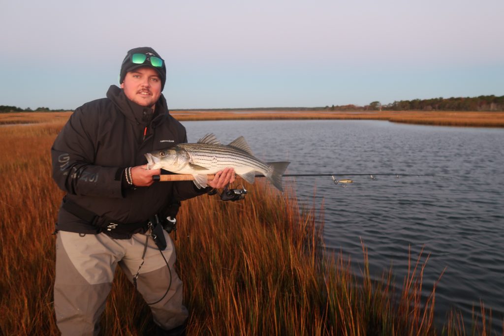 Each season is different, though. Two years back, the sand eel bite never really materialized. However, one November morning I discovered packs of tiny stripers racing west along the south side of Cape Cod. Metals, epoxy jigs, bucktail jigs and teasers, and small topwaters like the Rebel Jumpin’ Minnow and 3.75-inch Monomoy Tackle Z-Step brought “diaper stripers” to hand for almost a week as they fed on bait too tiny for me to distinguish. They ate so close to shore that casting was not even necessary. A backhanded pitch of the plug or jig just 20 feet off the beach was all it took to tempt those hungry schoolies, and although it wasn’t the most exciting fishing, it was reliable light-tackle action. Once they disappeared, I ventured to a marsh opposite the beach and conjured up a few larger, mid-20-inch fish from a muddy-bottomed pond. This sort of late-fall fishing is not unique to Cape Cod; it happens all along the coasts of Rhode Island and Connecticut as stripers sprint for Chesapeake Bay and wintering grounds around the Delaware and Hudson rivers.