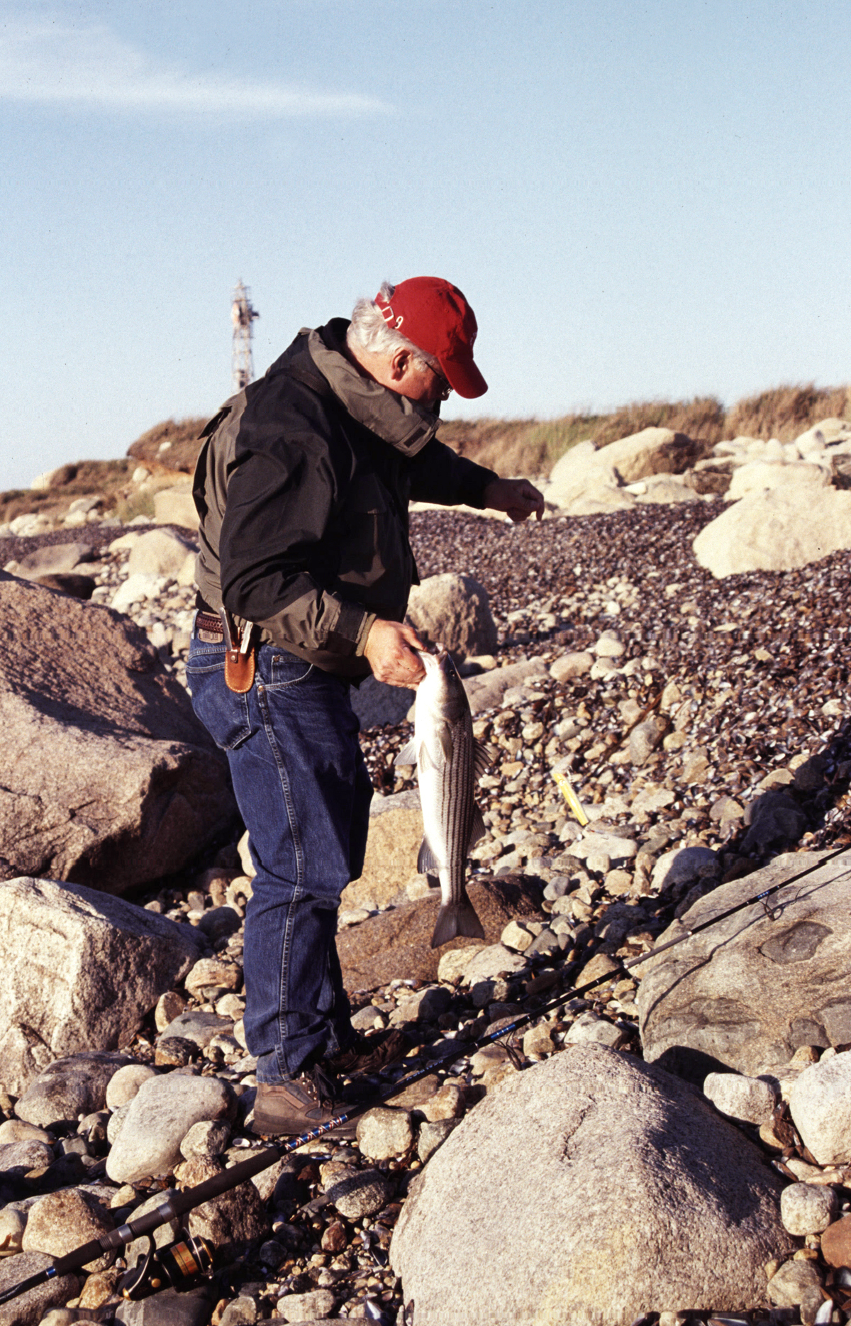 A few minutes pass and the fish is coming in, although I know it probably will make one more good run. Just behind the shore break it does but I know I have a solid hook set so I put on more pressure. Now it’s time to use the waves to surf it over the rocks. A minute or so later I have four fingers inside and my thumb outside the jaw of a striper that registers 24 pounds on the scale. Not bad at all, Mike says. I’m thinking that if I don’t catch another fish all night, this is enough. But, of course, I’m not ready to stop casting.
