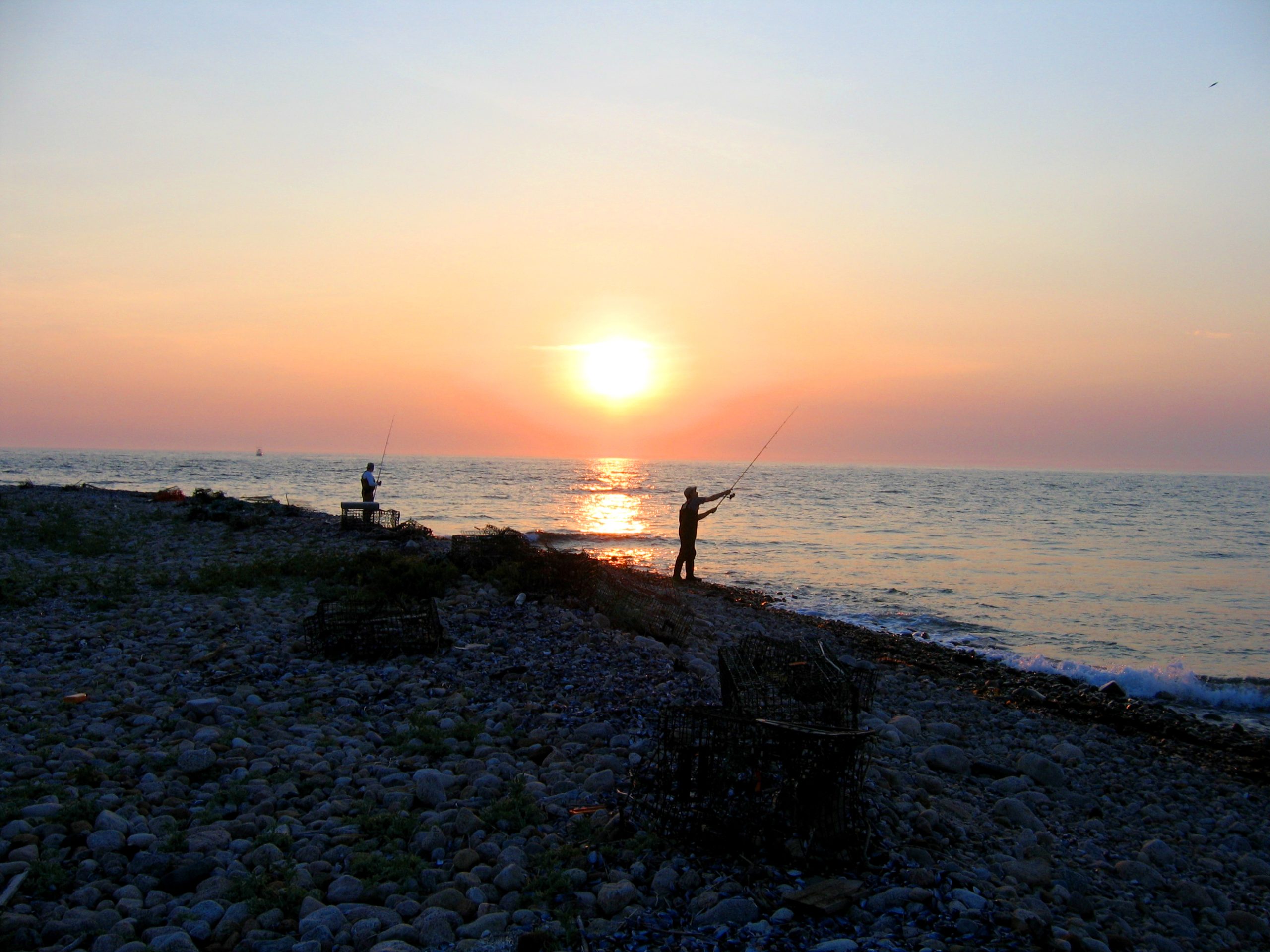 We spread out along the cobblestones, facing the wind, and clip on pencil poppers. Lining the shore are a confused jumble of dozens, probably hundreds of twisted metal lobster pots, line and buoys, natural and man-made detritus and stacks of blue-black mussel shells thrown there by sea. This is a wild, desolate, beautiful place, and when the sun hits the horizon and the skies begin to darken you feel like you’re standing at the very edge of the world. There is nowhere I’d rather be.