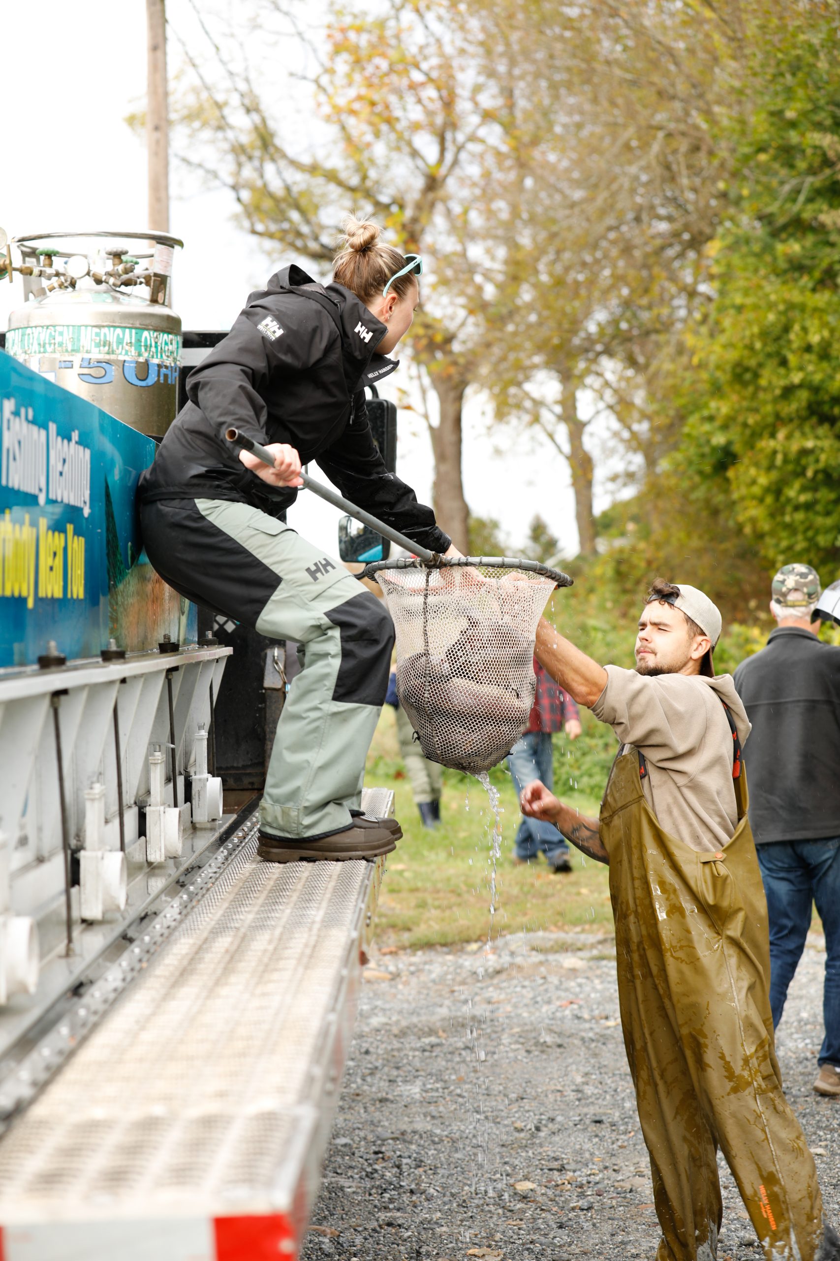 The process of getting trout from the hatchery to your favorite stream or lake seems straightforward, but it takes an experienced team of workers to do it right during each stocking. Teams walk a meshed screen from one end of the raceway to the other, corralling fish to a pumping system. Fish are then pulled into the pump as carefully as possible to be loaded into a small truck, which delivers them to a larger transport truck. By using a two-vehicle system, the hatchery can limit the amount of cross contamination, keeping the facility itself as clean as possible. The fish are then unloaded by hand in mesh nets to the larger transport truck, which then departs to the final destinations. These are the light blue-and-white trucks most anglers see on the road with on-board liquid oxygen tanks to keep the fish alive.