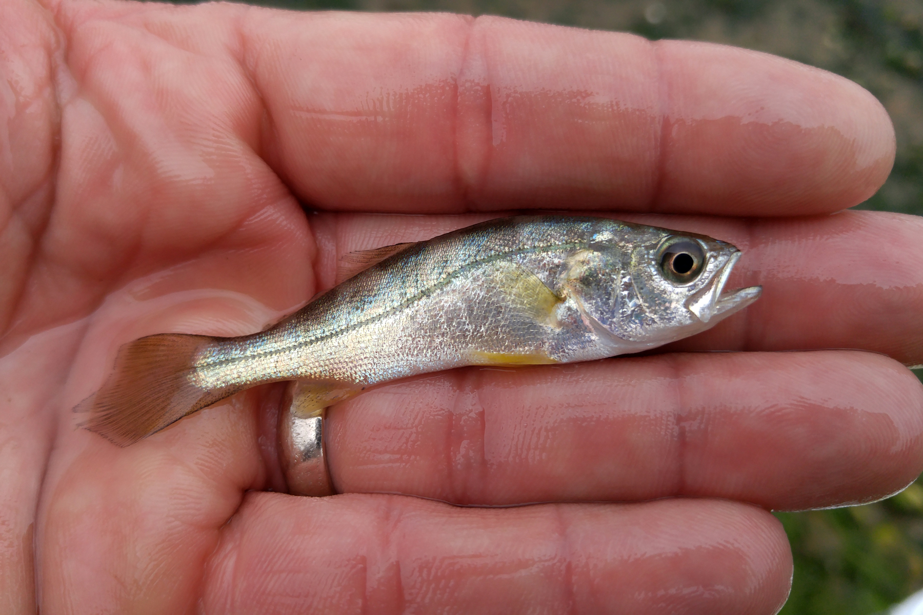 The energy sources fueling this impressive run are the countless numbers of baitfish that flood from the protection of the bays into the open ocean. One of the first baitfish to make this treacherous journey is the mullet. Mullet will swim in tight schools and are often observed grazing on the bottom, on the surface of vegetation, and even at the surface of the water. Mullet feed primarily on zooplankton and detritus. In the Northeast, it is possible to find two species of mullet—striped and white. Although they can get fairly large in the southern part of their range, with white mullet reaching 15 inches and striped mullet reaching 36 inches, we rarely see mullet in our area larger than the length of a finger—hence the name finger mullet.