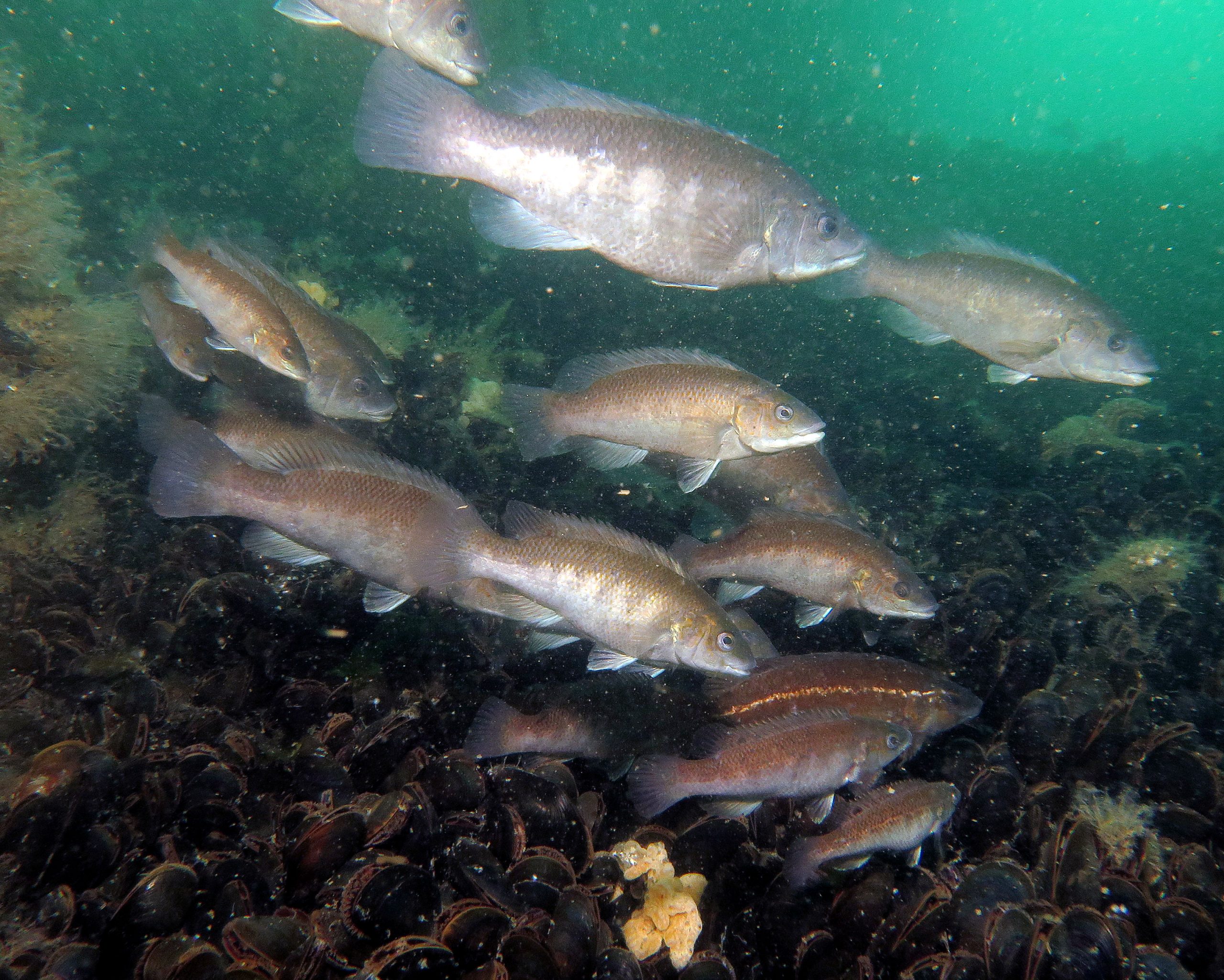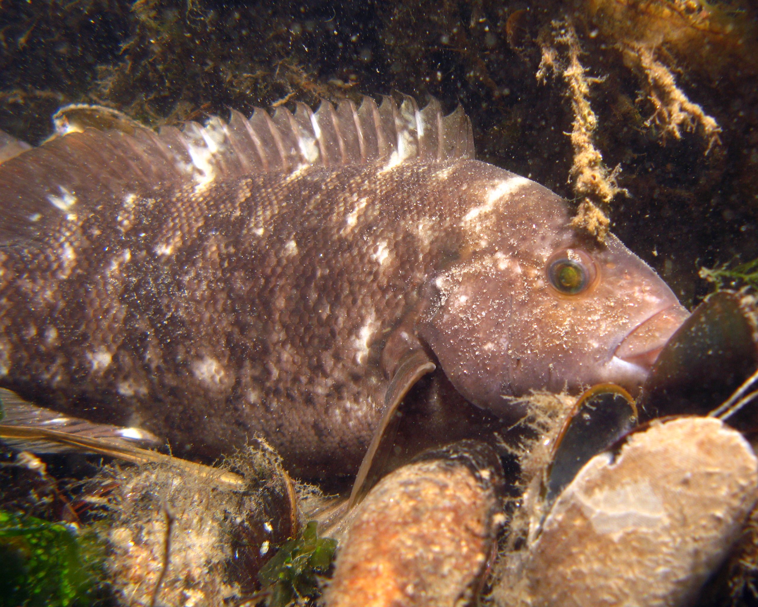 Adults and juveniles alike feed on an assortment of crustaceans and mollusks. Scanning their surroundings for food while patrolling their territory, they pluck small prey items such as blue mussels from the rocks and swallow them whole. Larger mussels are crushed with pharyngeal teeth that are located in their throat.