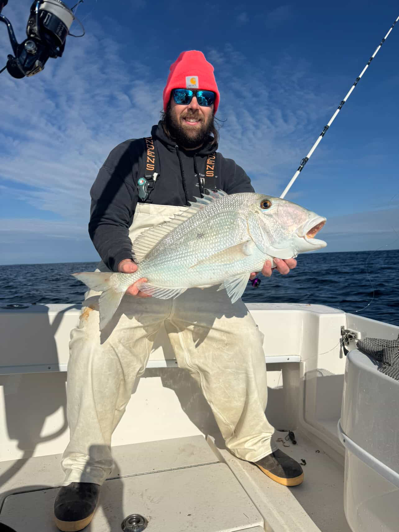 The fish turned out to be a jolthead porgy, a large, southern relative of our scup that lives on reefs and wrecks from North Carolina to Florida, and can grow to 20-plus pounds, though anything over 10 is considered a big one. Cassidy’s weighed 10.1 pounds (after being bled) and measured just under 27 inches – that’s one serious scup. Because the fish is so uncommon, New York does not have a state record category for jolthead porgies. The last record of a jolthead catch in New York was a 9-pounder off Montauk in 2018.