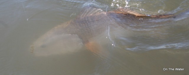 On Saturday, 10/29, I fished with Jeff Pierce from Mustad, and our focus was going to be redfish. Our guide, Brady, took us right to a large dock sitting off a point in the southern end of the lake where he’d been finding redfish consistently in recent trips. We anchored up and began tossing Bomber Mud Minnow Paddle Tails up toward the pilings and worked them back to the boat along the bottom. Within a few casts, I connected with a small flounder, which we tossed back. Before the flatfish was out of sight, Brady set up on something a good deal larger. The fish streaked out into open water where a pod of dolphins was criss-crossing and working bait. “This is a red,” Brady said. After a long fight, I was surprised to see the fish’s size when it finally came into view through the murky waters.