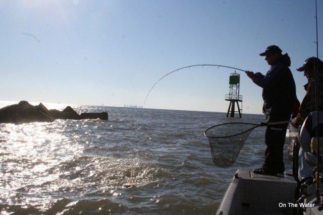 We picked away for another half-hour or so, with a few small black drum and croakers coming to the boat. Then Brady got a fish call that the “bull” reds were chowing down at the jetties where Lake Calcasieu enters the Gulf of Mexico.