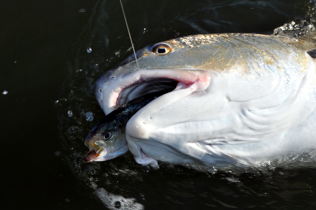 As the experienced fisherman, I offered some coaching, explaining that he was using a relatively light spinning outfit and should let the fish run when it wants to, and then work the line back in when it stops. Redfish fight hard for their size, I told him, and I knew that because I’d caught them up to 10 pounds. Then, the fish suddenly came up and started thrashing water, and I stopped talking. Was I really looking at a redfish with all the bulk of a 30-pound striped bass?